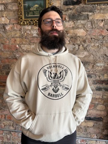 Black print on sand biege hoody. Features Rockwell Barbell branding on front and back. No tag inside. Warm and comfortable Gildan heavy blend hoodie.